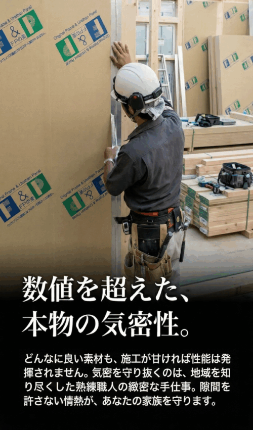 圧倒的な高断熱・高気密、高い省エネ性能で経済的、FPウレタン断熱パネルと気密施工で、理想の室内空間設計が実現できます。