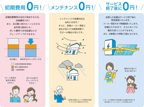 サービス契約者は、設備設置の場所(屋根など)を無償で貸与し、そこで発電した電気を使用することができるもので、その対価として毎月固定のサービス料を支払います。